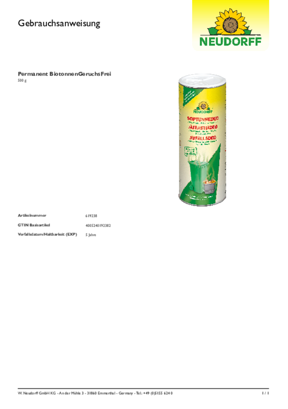 Ensikäyttö: Paina raeaukko sisään ja käännä raesihti aukon päälle. Levitä ennaltaehkäisevässä tarkoituksessa tyhjään jäteastiaan tai biojäteastiaan. Kun levität Jäteastiadeo -rakeita kevyesti ravistamalla säännöllisin väliajoin uuden jätteen päälle, ikävät hajut neutraloituvat tehokkaimmin.